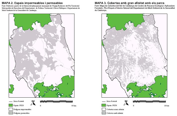 A partir de la síntesi del planejament municipal, s'ha obtingut el Mapa 2, Espais impermeables i permeables, on el territori es divideix segons el planejament en polígons que funcionen com a separadors ecològics dels espais naturals i/o agrícoles, que anomenem polígons impermeables, i en polígons que per les característiques permeses en el planejament són espais que no impedeixen en general el flux normal d'organismes, aquests els anomenem polígons permeables.. En segon lloc, s'ha analitzat les cobertes d'una part dels parcs de Collserola i de Sant Llorenç significativa en superfície i pròxima al territori situat entremig dels espais PEIN a connectar. Obtenint els resultats que es mostren a la taula 3.